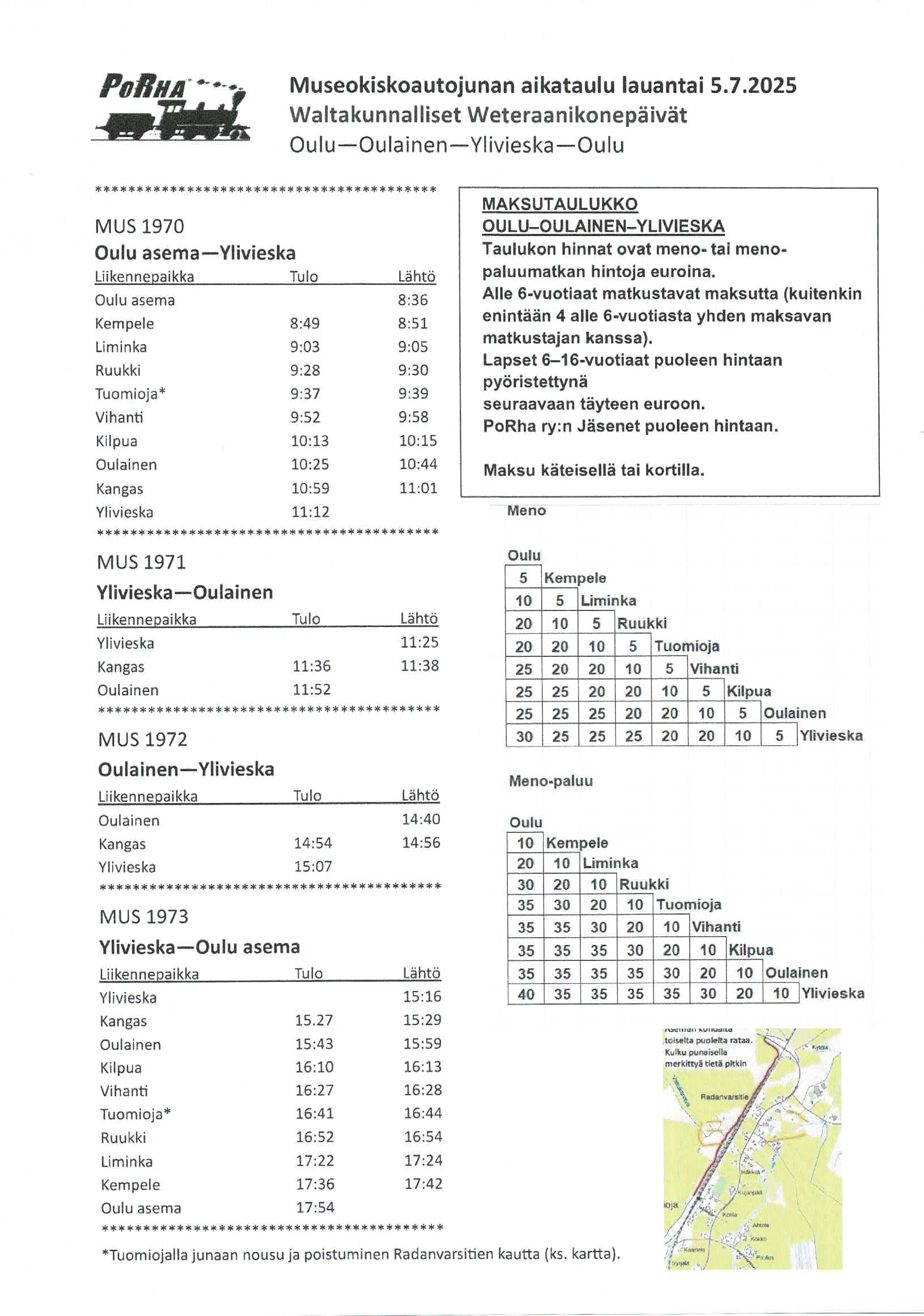 PoRha ry:n Lättähattu liikennöi lauantaina Oulu – Oulainen – Ylivieska – Oulainen – Oulu. Oulaisten Rautatieasemalta linja-autokuljetus. Aikataulu.